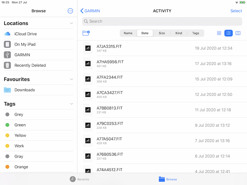 In common with most (but not all) iPads, my device has a lightning connector, and there’s no way to directly plug in a USB cable. However, Apple make a camera adaptor, which plugs into the lightning port and has a USB socket along with another lightning port. I’ve used this in the past to connect my camera and to use a mouse with my iPad. Unfortunately, when I connected my Edge 530, I got mixed results. The Garmin showed all indications of being connected to a computer, but the screen showed ‘External Power Lost’. I took this as an indication that the iPad didn’t have enough power for the Garmin. Connecting a lightning cable from a powered hub to lightning port on the camera adaptor fixed this, and the Garmin appeared in the ‘Files’ App. It DOES take some time to appear, though.
