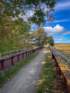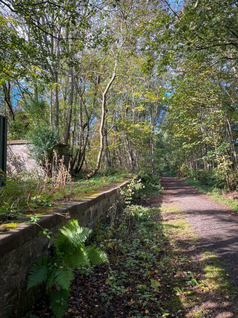 After a short rest, I retraced my route back out of Fraserburgh, past the golf course, heading for Maud. For the first 10-or-so km, the route climbs noticeably. The path is also narrower than the Peterhead branch, with more overgrowth at the edges.